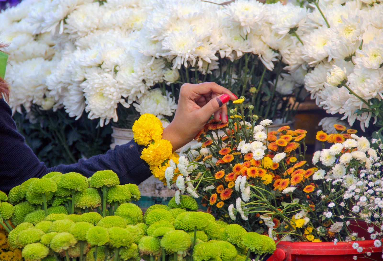 ভোটের পরদিন ফাগুন উদযাপনে ফুলের দোকানে সন্তানসহ এক নারী। ১৩ ফেব্রুয়ারি ২০২৬