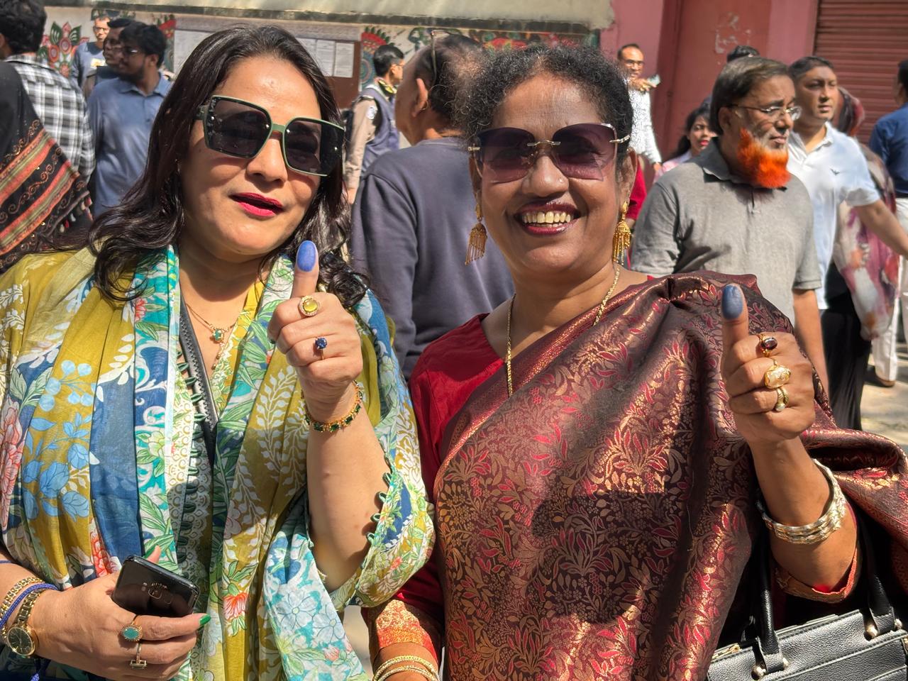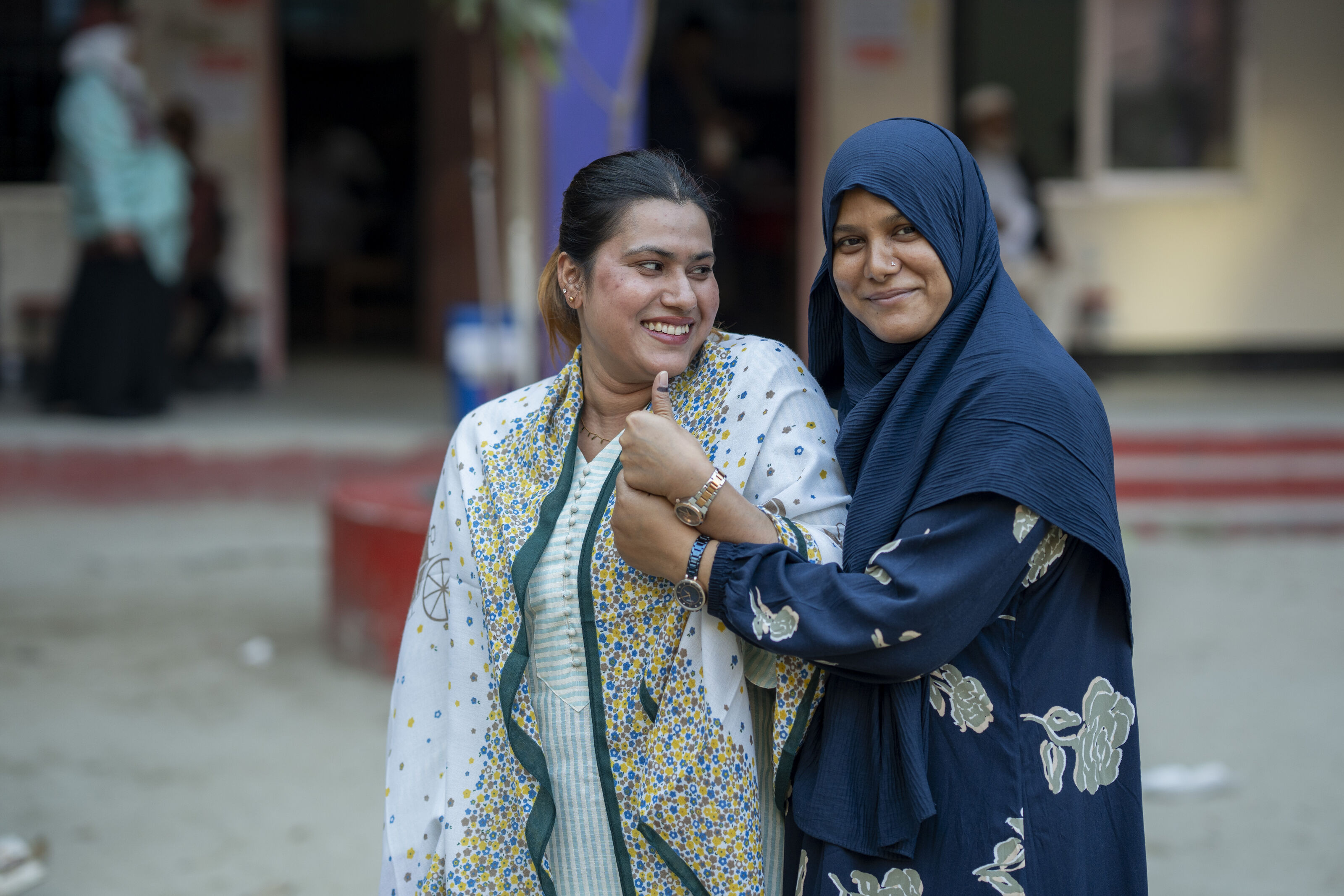 ভোট দেওয়া শেষে উচ্ছ্বসিত দুই নারী। ১২ ফেব্রুয়ারি ২০২৬