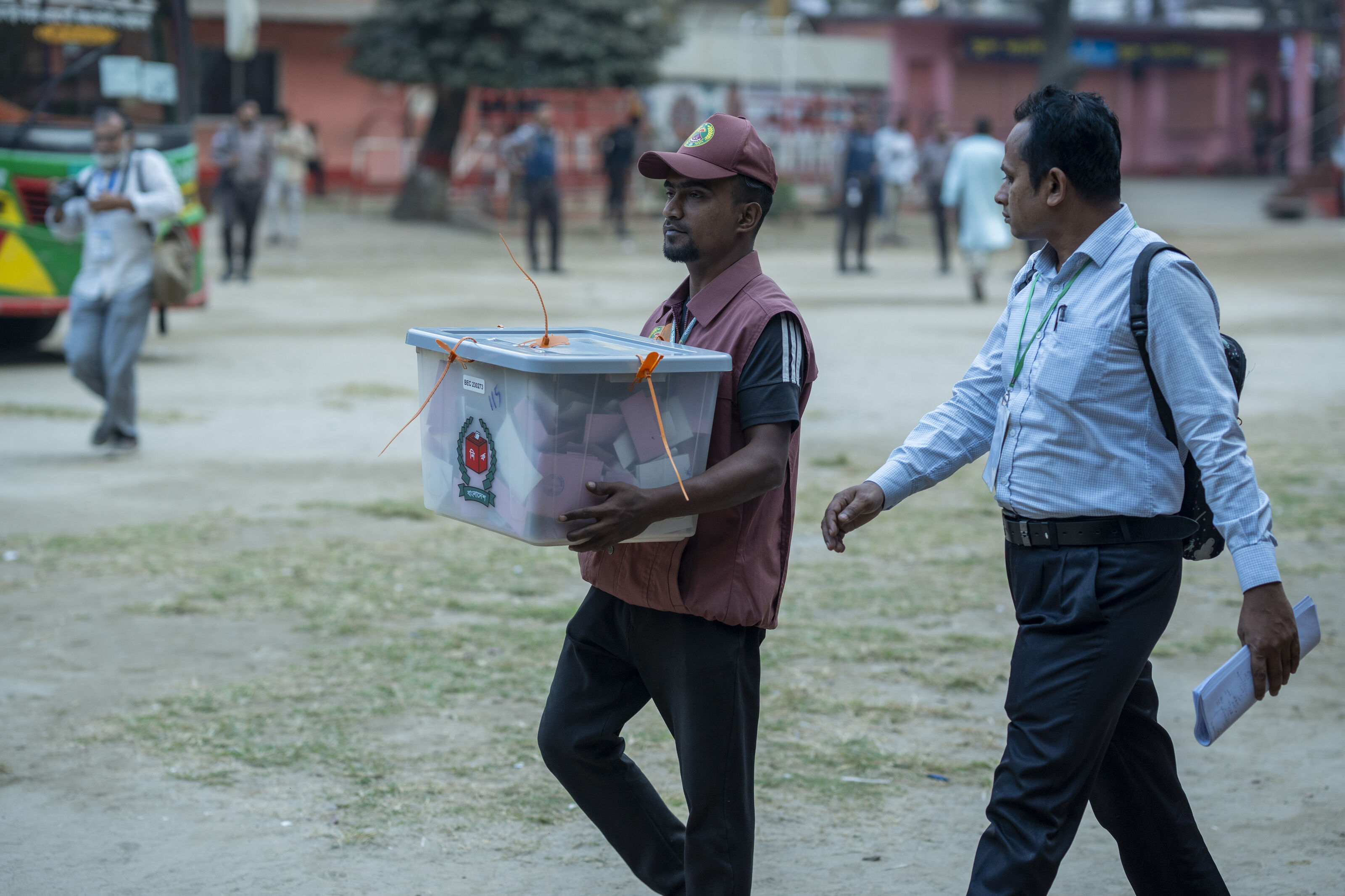 ভোট গণনার উদ্দেশ্যে ব্যালট নিয়ে যাচ্ছেন নির্বাচনি কর্মকর্তারা। ১২ ফেব্রুয়ারি ২০২৬