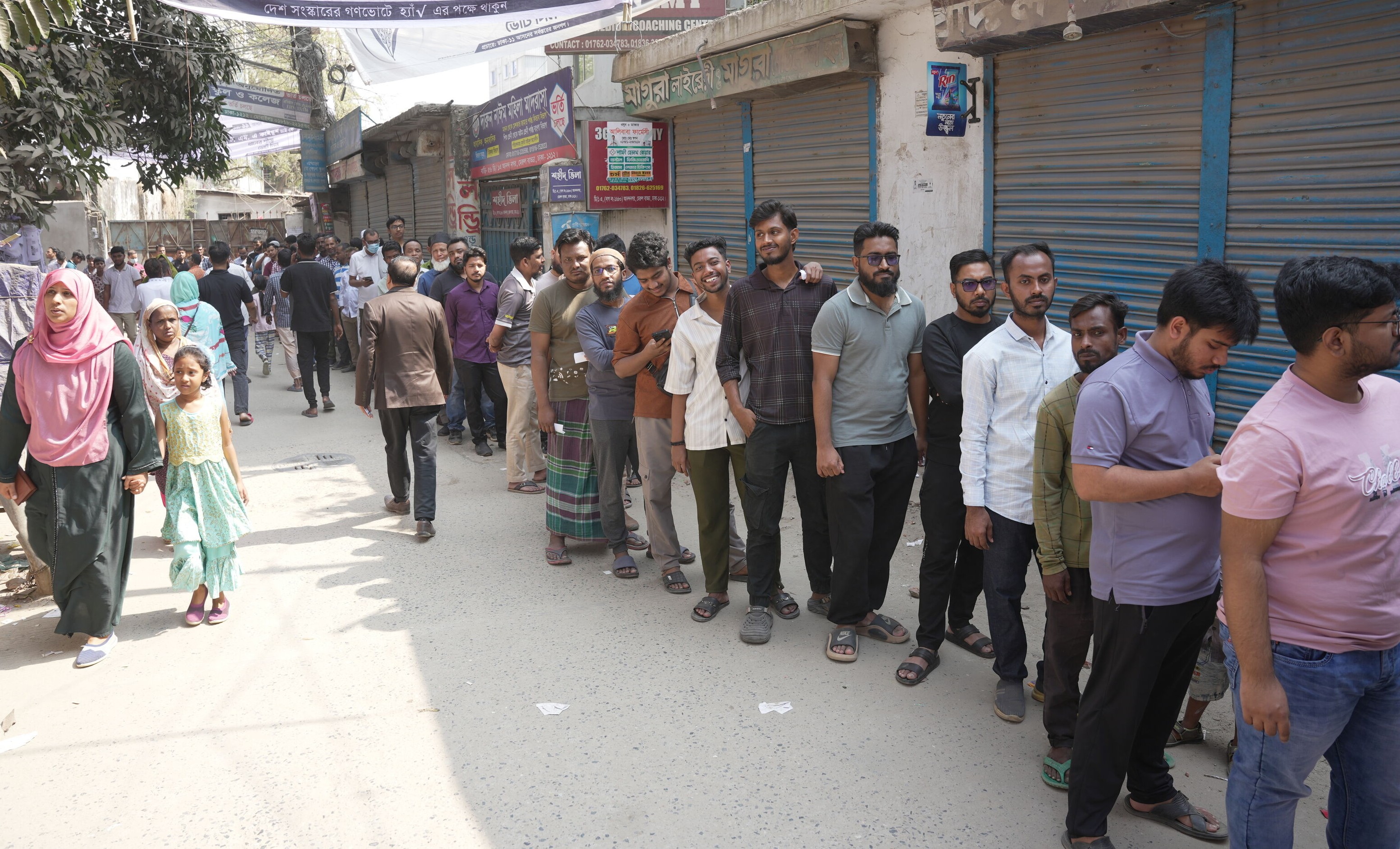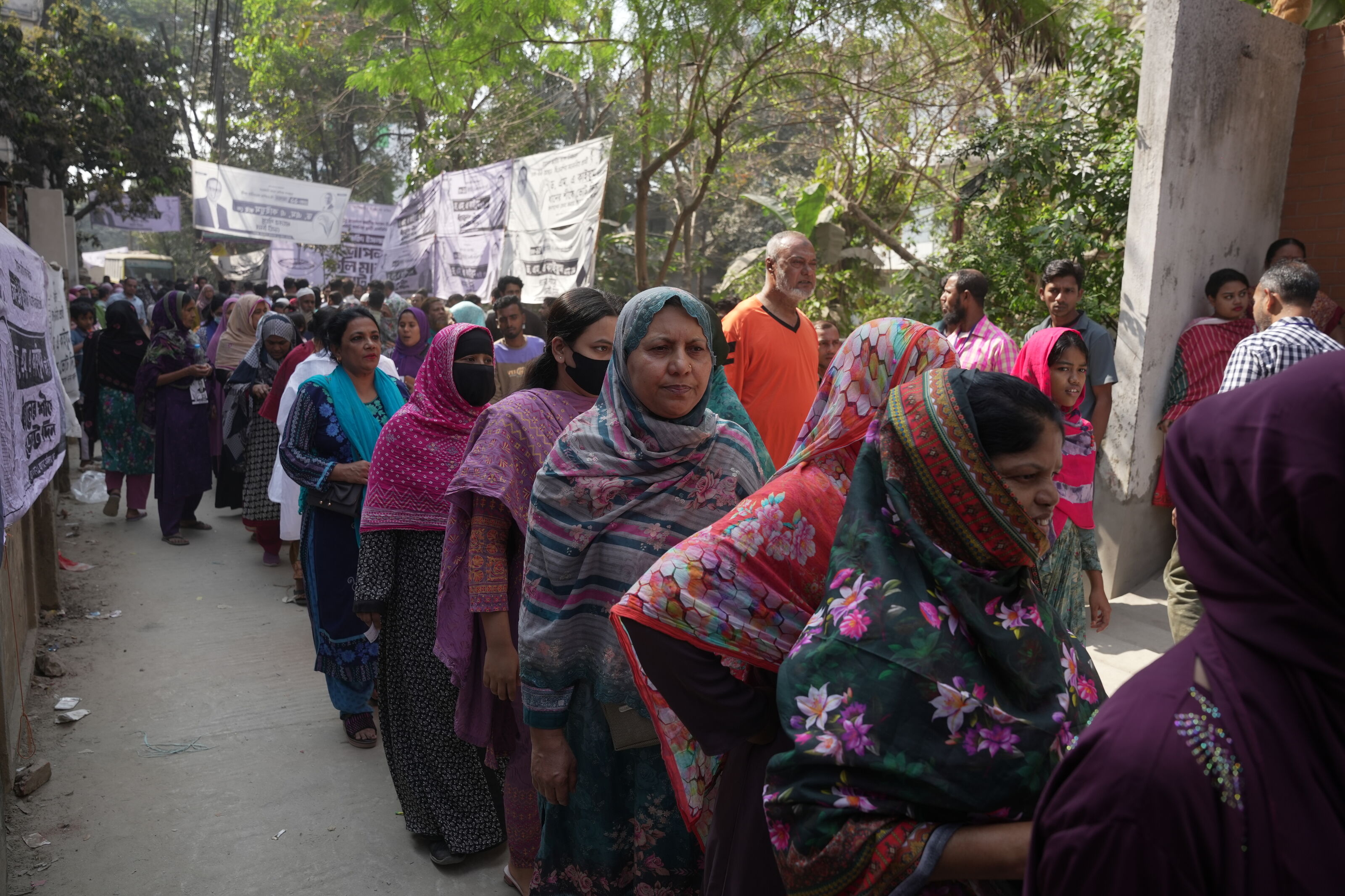 রাজধানীর বাড্ডার একটি কেন্দ্রে সারিবদ্ধভাবে অপেক্ষারত পুরুষ ভোটাররা। ১২ ফেব্রুয়ারি ২০২৬