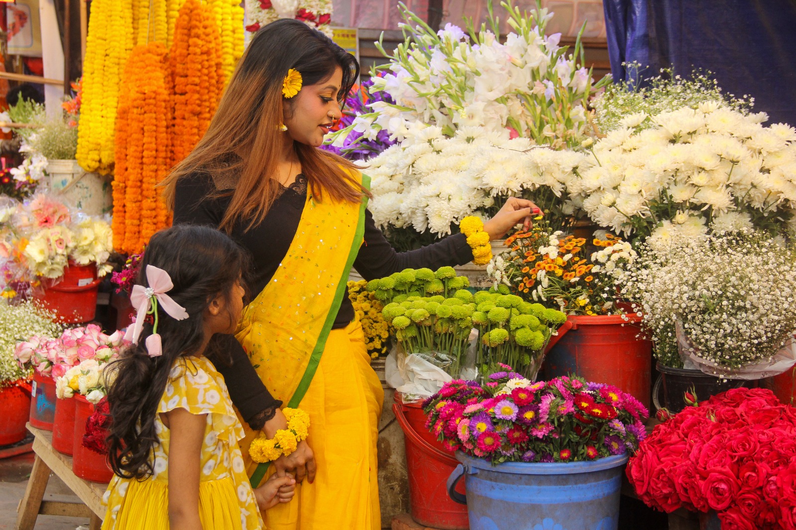 ভোটের পরদিন ফাগুন উদযাপনে ফুলের দোকানে সন্তানসহ এক নারী। ১৩ ফেব্রুয়ারি ২০২৬