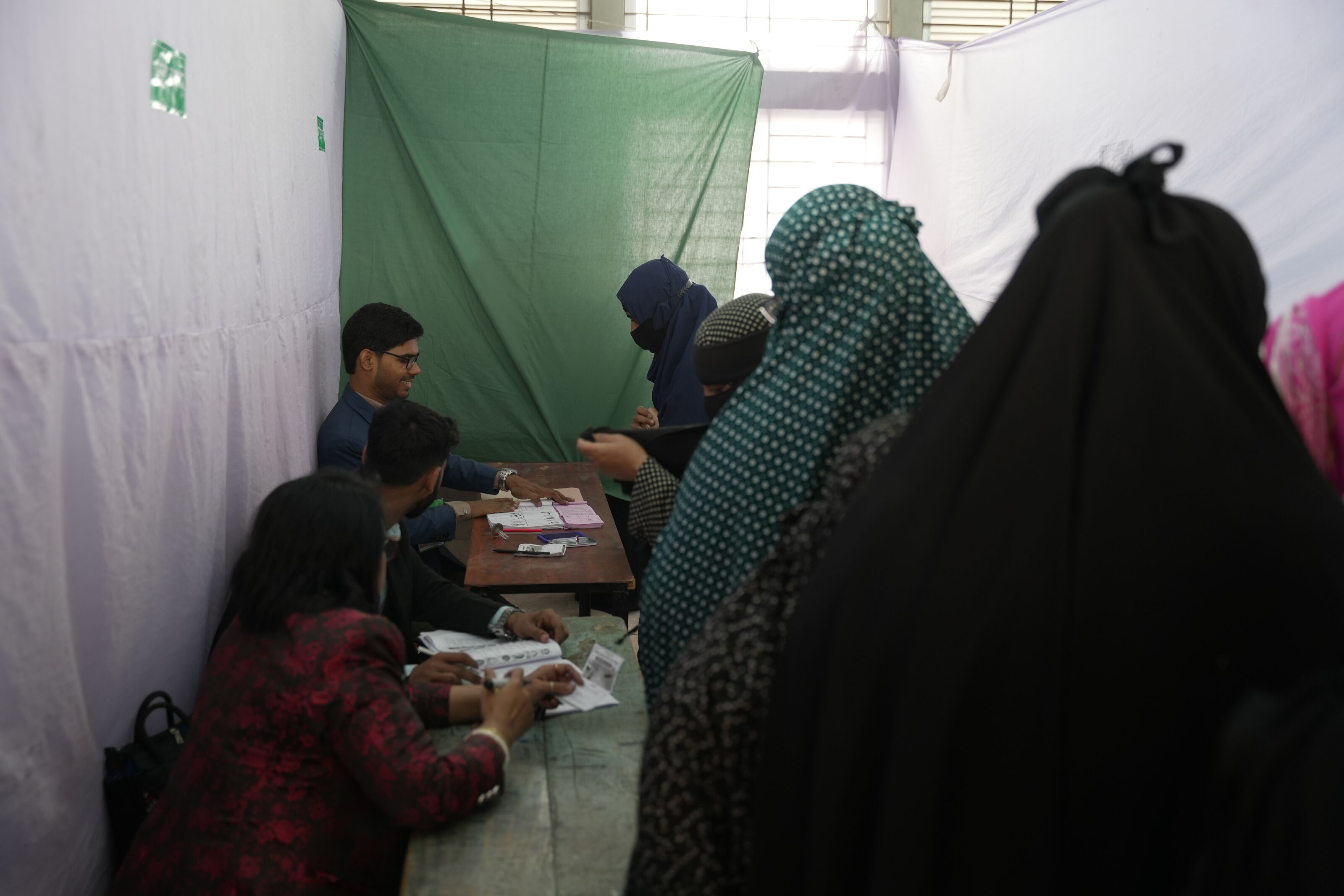 রাজধানীর একটি কেন্দ্রে ভোট দেওয়ার অপেক্ষায় নারী ভোটাররা। ১২ ফেব্রুয়ারি ২০২৬